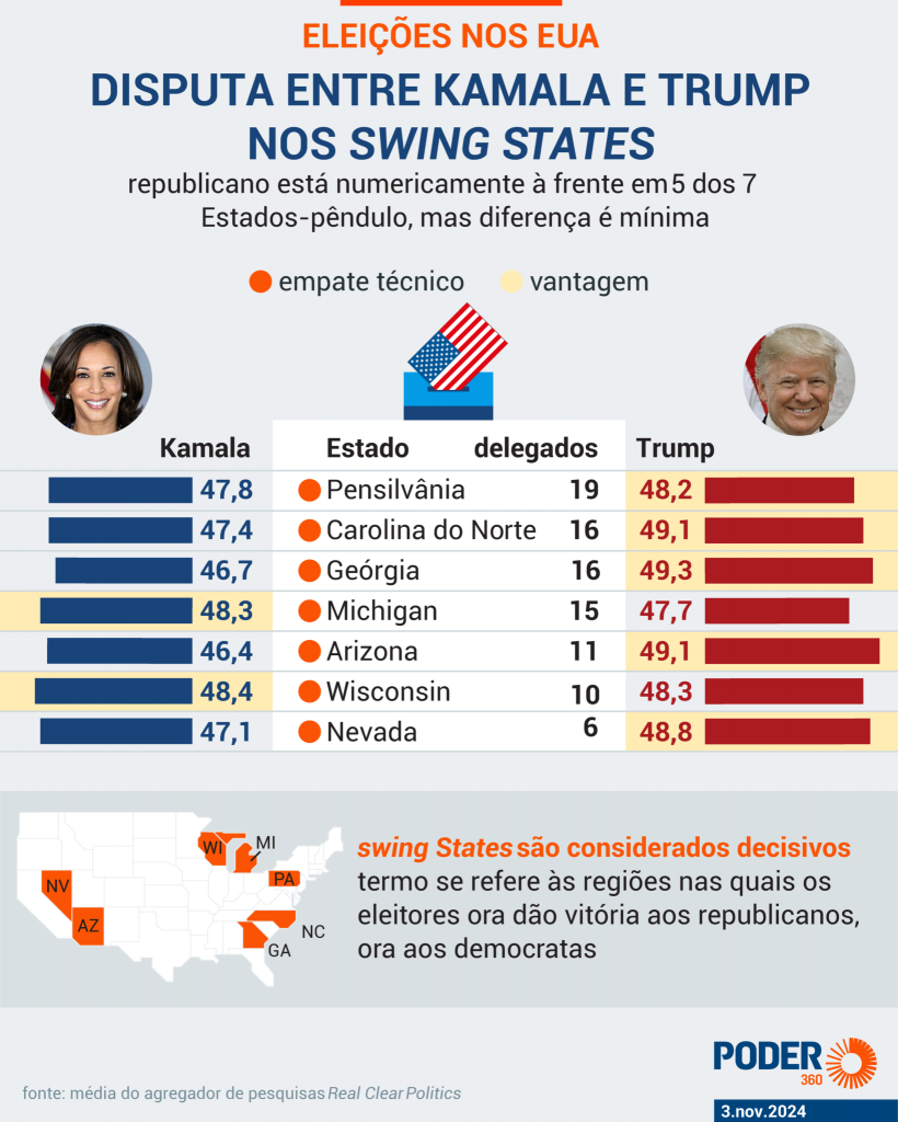 A 2 dias da eleição presidencial nos Estados Unidos, o ex-presidente Donald Trump (Partido Republicano) e a vice-presidente Kamala Harris (Partido Democrata) estão tecnicamente empatados em 7 swing States (ou Estados-pêndulo), aqueles em que não há uma preferência definida e vão decidir o pleito.