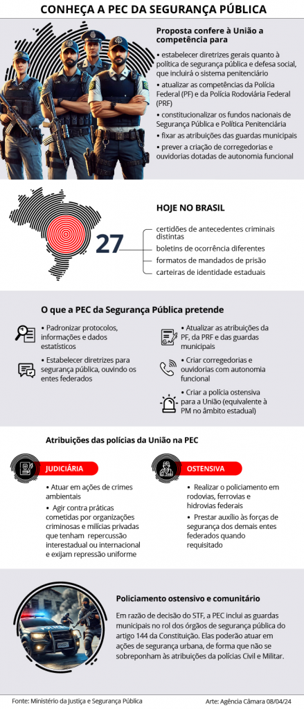 Também citou novas competências para a Polícia Federal, no combate a grandes crimes ambientais, e a criação da Polícia Viária Federal, com atribuições de policiamento ostensivo em estradas, ferrovias e hidrovias federais. “Já existe, dentro das competências da Polícia Federal, a atribuição de exercer o papel de polícia aeroportuária. Nós temos uma Guarda Portuária. Tem também uma Polícia Ferroviária. Inclusive agora, com a privatização das ferrovias e dos portos, ela está em extinção, digamos assim. Mas ela seria substituída por essa Polícia Viária.”
