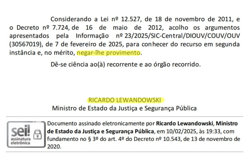 “Entende-se que a solicitação em questão não pode ser atendida, uma vez que os dados solicitados referem-se à saúde e estão vinculados a uma pessoa natural, configurando-se como dados pessoais sensíveis, nos termos do art. 5º, inciso II, da Lei nº 13.709/2018 (Lei Geral de Proteção de Dados Pessoais – LGPD)”, escreveu o ouvidor-geral do MJSP, Sergio Gomes Velloso, em decisão referendada pelo próprio Lewandowski no último dia 10 de fevereiro.