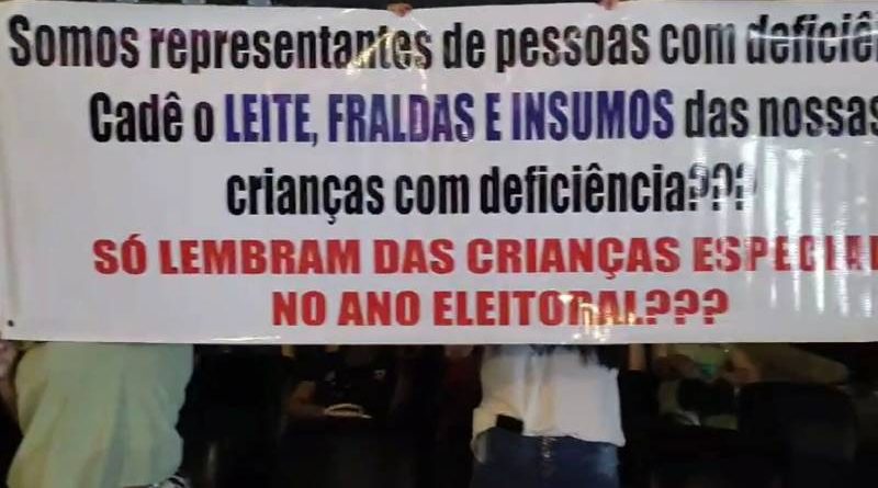 O grupo levantou duas faixas com questionamentos às participantes do encontro: “E se fosse o seu filho? Nossos filhos existem e têm seus direitos decretados por liminar. Respeite as decisões judiciais!” e “Somos representantes de pessoas com deficiência. Cadê o LEITE, FRALDAS E INSUMOS das nossas crianças com deficiência??? SÓ LEMBRAM DAS CRIANÇAS ESPECIAIS NO ANO ELEITORAL???”