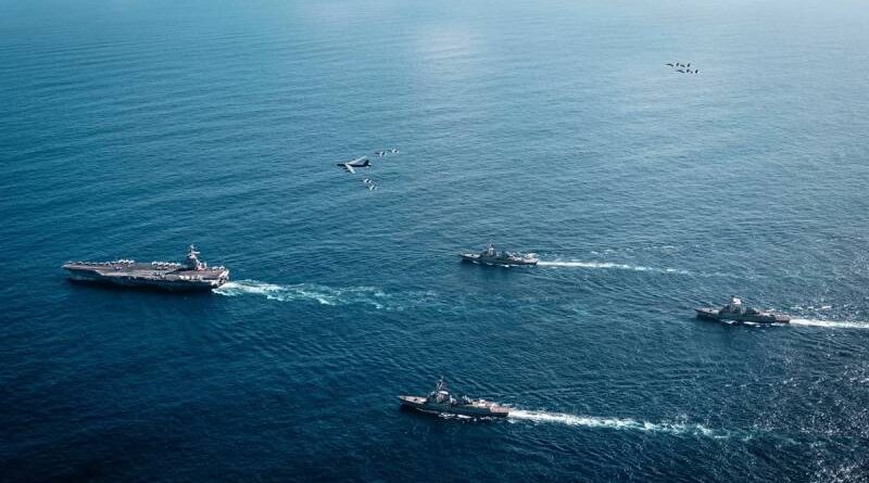 Além do porta-aviões, as imagens mostram outros tipos de embarcações, jatos de ataque próximos a eles e um avião bombardeiro B-52 Stratofortress.