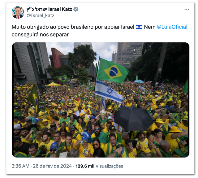 O ministro das Relações Exteriores israelense, Israel Katz, agradeceu nesta 2ª feira (26.fev.2024) pelo apoio de brasileiros a Israel durante o ato do ex-presidente Jair Bolsonaro (PL) no domingo (25.fev) na av. Paulista, em São Paulo. Diversos apoiadores do ex-chefe do Executivo levaram bandeiras de Israel para a manifestação. Bolsonaro também iniciou sua participação no evento exibindo um exemplar.
