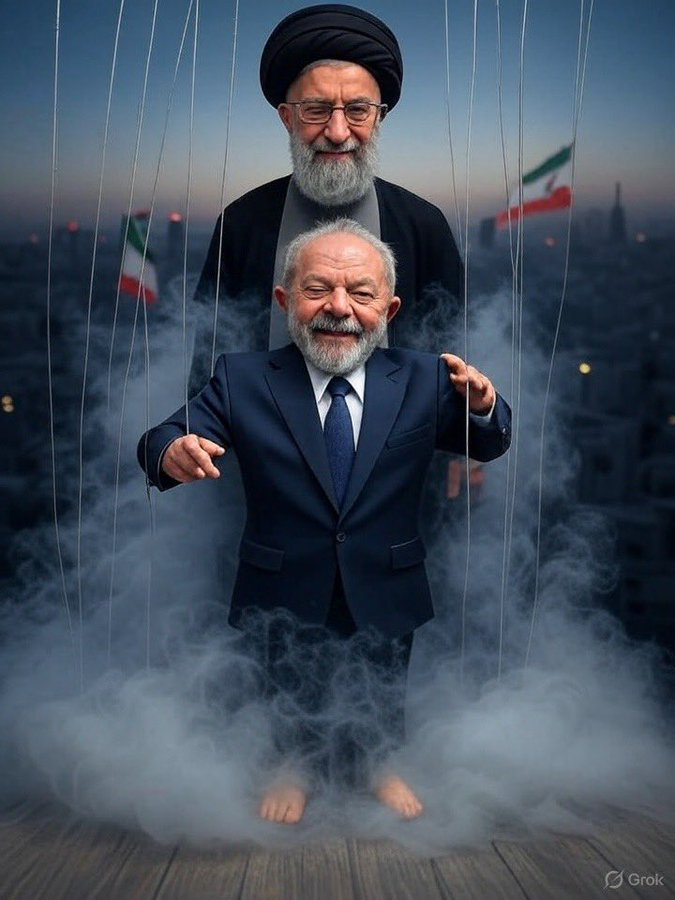 As declarações do ministro foram divulgadas na rede social X, escritas em português e acompanhadas de uma imagem gerada por inteligência artificial, na qual o líder supremo do Irã, Ali Khamenei, aparece atrás do presidente Lula, segurando cordas de marionete, como se estivesse controlando-o. Veja: