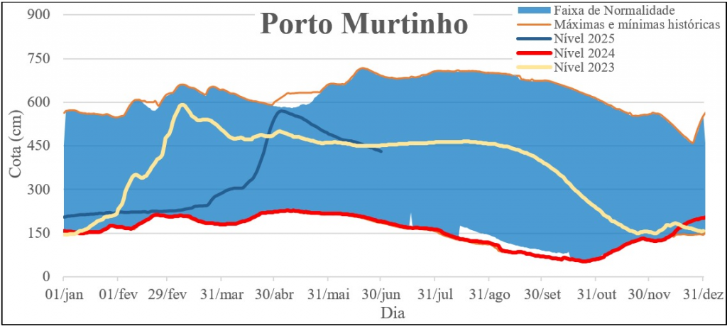 Os dados são provenientes das estações hidrometeorológicas de Ladário e Porto Murtinho e cobrem o período até o final de junho deste ano. Os gráficos comparativos revelam que, embora haja um aumento específico nas cotas em comparação com 2024, ainda não se atingiram os patamares de dois anos atrás.