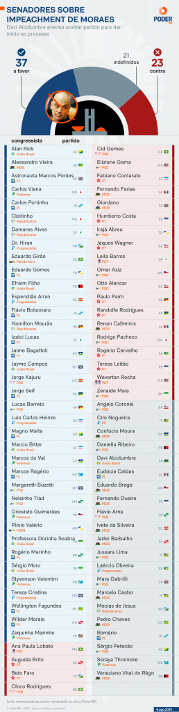No site, constam na lista dos indefinidos os senadores Eliziane Gama (PSD-MA), Giordano (MDB-SP), Renan Calheiros (MDB-AL) e Zenaide Maia (PSD-RN), mas o Poder360 apurou que eles são contra o impeachment de Moraes.