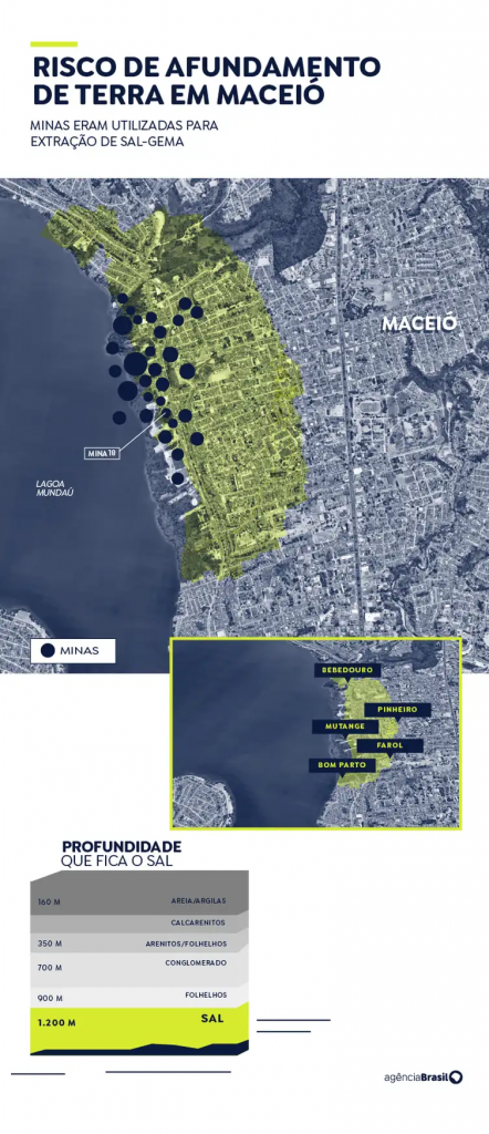 O problema em Maceió ocorreu por vazamento dessa solução líquida, deixando buracos na camada de sal. Uma hipótese já levantada por pesquisadores é de que a ocorrência tenha relação com falhas geológicas na região. Consequentemente, a instabilidade no solo levou a um tremor de terra sentido em março de 2018. O evento causou os afundamentos nos cinco bairros: Pinheiro, Mutange, Bebedouro, Bom Parto e Farol.