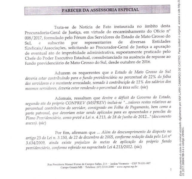 Em reposta, promotora de Justiça do Ministério Público Estadual (MPE-MS) e assessora especial do procurador-geral de Justiça, Ana Lara Camargo de Castro, em parecer no dia 28 de agosto de 2017, ela reconhece que o governo do Estado recolheu o recurso para pagar outras demandas. “O recorrente ou recolhia as contribuições previdenciárias ou pagava os servidores e fornecedores”, descreveu. No entanto a Ministério Público acabou arquivando a denúncia.