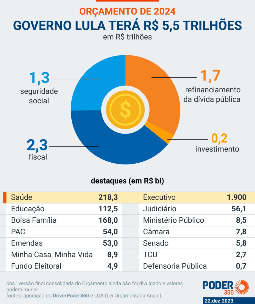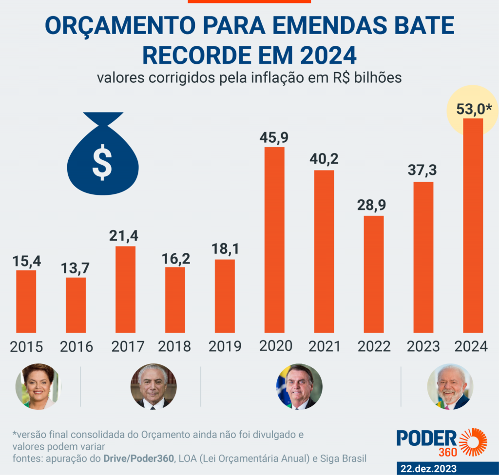 Aprovado nesta 6ª feira (22.dez.2023) pelo Congresso Nacional, o Orçamento de 2024 é de R$ 5,5 trilhões. A peça orçamentária estipula um valor recorde para liberação anual de emendas parlamentares: cerca de R$ 53 bilhões. Os dados consolidados ainda não foram divulgados e podem variar.