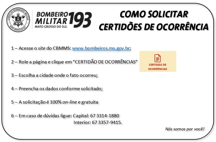 Campo Grande (MS) – O Corpo de Bombeiros Militar do Estado de Mato Grosso do Sul orienta aos interessados que precisam retirar certidões da corporação que acompanhe abaixo o passo a passo para solicitar os documentos. Caso tenha alguma dúvida ou dificuldade, por gentileza, entrar em contato no (67) 3314-1880 ou (67) 3357-9415