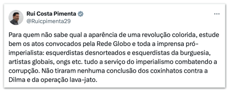 Rui Costa Pimenta, presidente da sigla, chama os atos de “revolução colorida” e diz que foram organizados a serviço do imperialismo