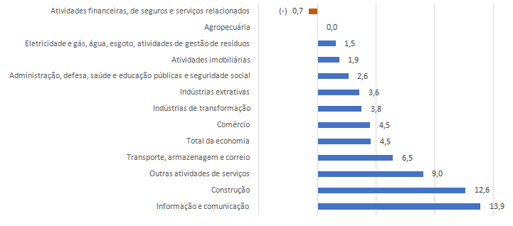 Em 2021, onze dos doze grupos de atividades econômicas apresentaram crescimento ou estabilidade, com destaque para Informação e comunicação (13,9%) e Construção (12,6%).