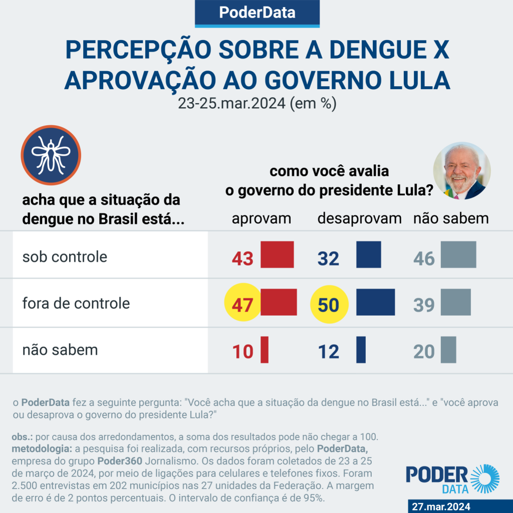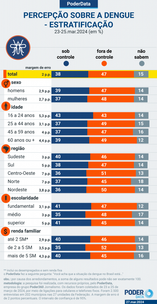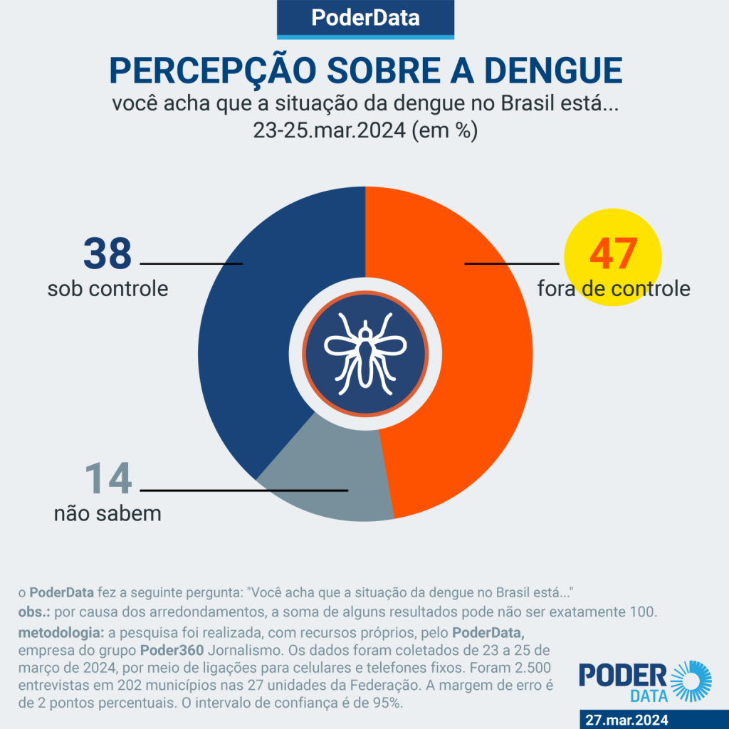 Quase metade (47%) dos brasileiros considera que a situação da dengue está fora de controle no país. Só 38% acham que o cenário de infecções pelo Aedes aegypti está “sob controle”, segundo pesquisa PoderData realizada de 24 a 25 de março de 2024. Outros 14% não souberam responder.
