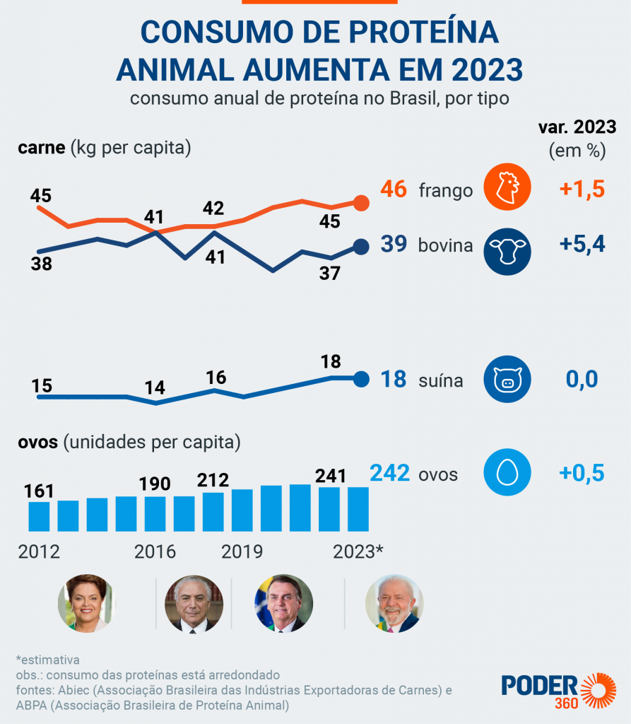 As pessoas agora consomem, em média, uma unidade a mais de ovo por ano –passando a ingerir 242 no período. O consumo de carne de porco se manteve estável em 18 kg por ano. Nenhuma das proteínas registrou queda.