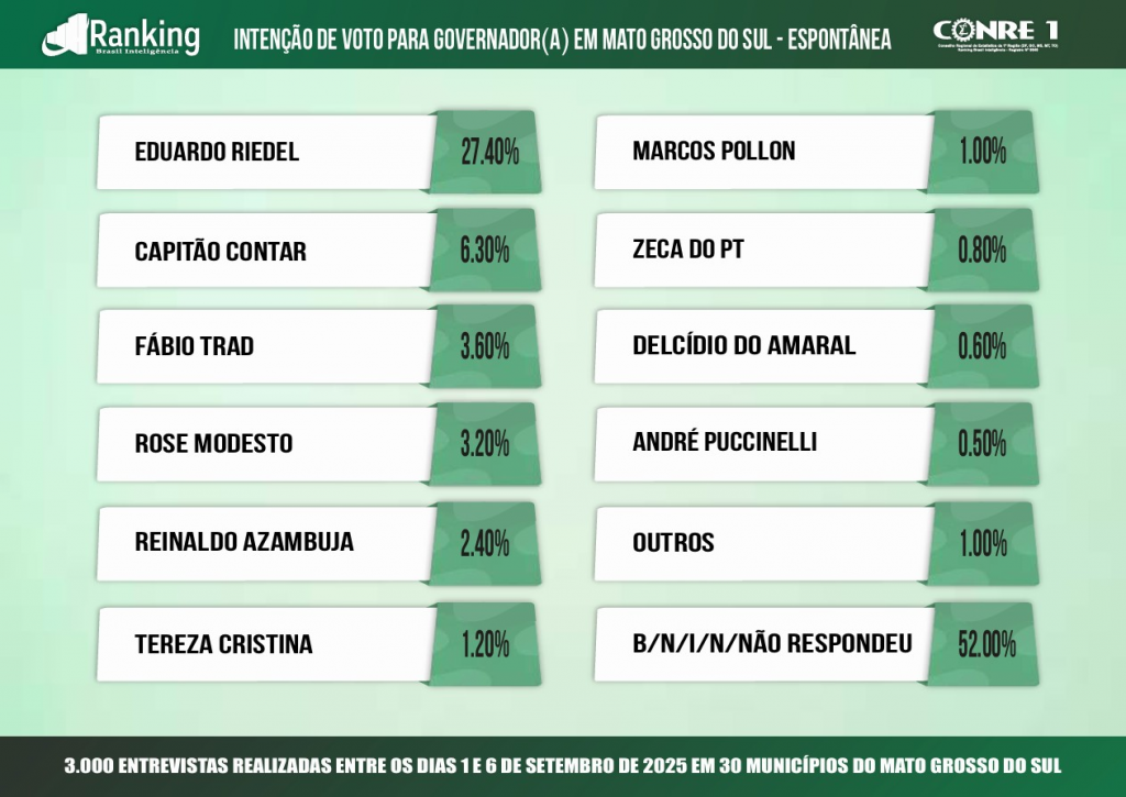 Na espontânea, quando é feita a pergunta aos entrevistados e não é dada nenhuma alternativa para resposta, Eduardo Riedel foi citado por 27,40% dos entrevistados; Capitão Contar, por 6,3%; Fábio Trad, 3,6%; Rose Modesto, 3,20%; o ex-governador Reinaldo Azambuja (PL), 2,4%; a senadora Tereza Cristina (PP), 1,2%.