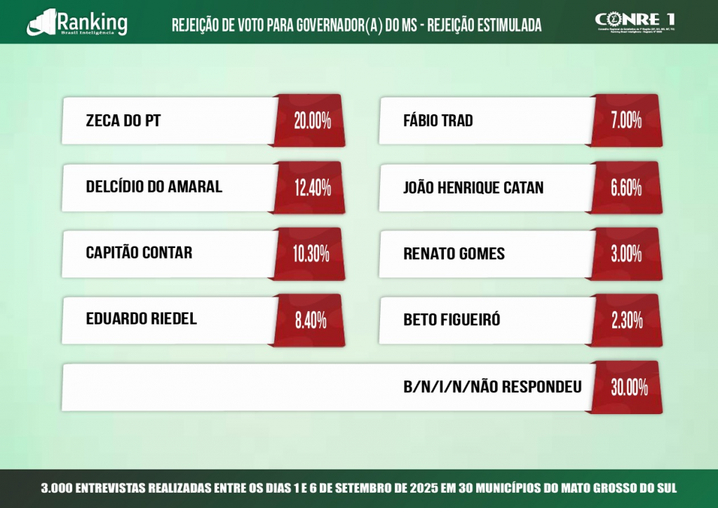 No quesito rejeição estimulada, Zeca do PT lidera com 20%, seguido por Delcídio, com 12,4%, Contar, com 10,3%, Riedel, com 8,4%, Fábio, com 7%, João Henrique, com 6,6%; Renato Gomes, 3%; e Beto Figueiró, 2,3%, sendo que 30% não sabem, não responderam, não votariam em nenhum deles ou votariam em branco.
