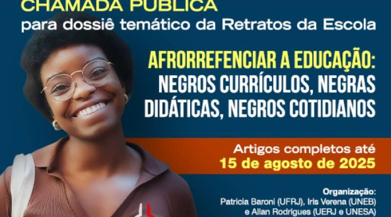 A terceira edição de 2025 da Retratos da Escola (volume 19, número 45) terá como tema Afrorrefenciar a Educação: negros currículos, negras didáticas, negros cotidianos sob organização de Patricia Baroni (UFRJ), Iris Verena (UNEB) e Allan Rodrigues (UERJ e UNESA).