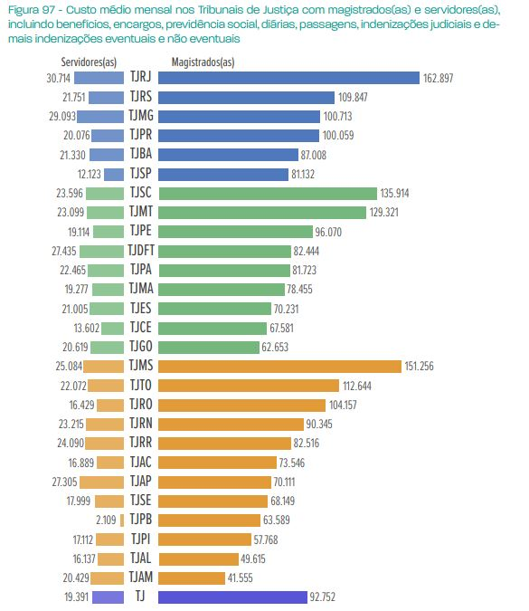 Em média, segundo o relatório, as despesas com pessoal são responsáveis por 87% da despesa total da Justiça Estadual e compreendem, além da remuneração com magistrados(as), servidores(as), inativos(as), terceirizados(as) e estagiários(as), todos os demais auxílios e assistências devidos, tais como auxílio-alimentação, diárias, passagens, gratificações etc.
