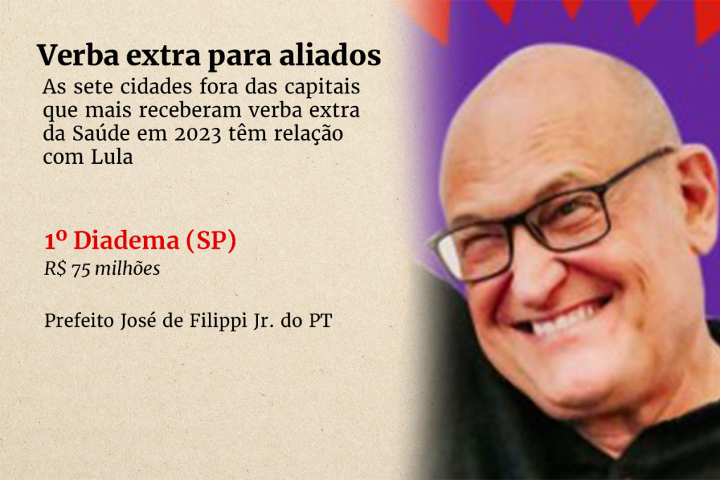 A cidade fora da capital que mais recebeu a verba extra foi Diadema, no interior de São Paulo, que levou R$ 75 milhões. Praticamente todo o valor foi liberado em uma portaria de 30 de outubro. No mesmo dia, o prefeito José de Filippi Jr. (PT) usou as redes sociais para agradecer.