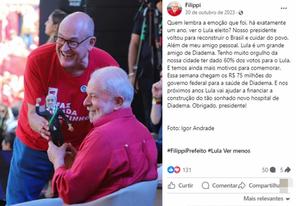 “Além de meu amigo pessoal, Lula é um grande amigo de Diadema. Tenho muito orgulho de a nossa cidade ter dado 60% dos votos para o Lula. E temos ainda mais motivos para comemorar. Nesta semana, chegam os R$ 75 milhões do governo federal para a saúde de Diadema. E, nos próximos anos, Lula vai ajudar a financiar a construção do tão sonhado novo hospital de Diadema. Obrigado, presidente!”, escreveu Filippi, tesoureiro da campanha de Lula em 2006 e de Dilma Rousseff (PT) em 2010.