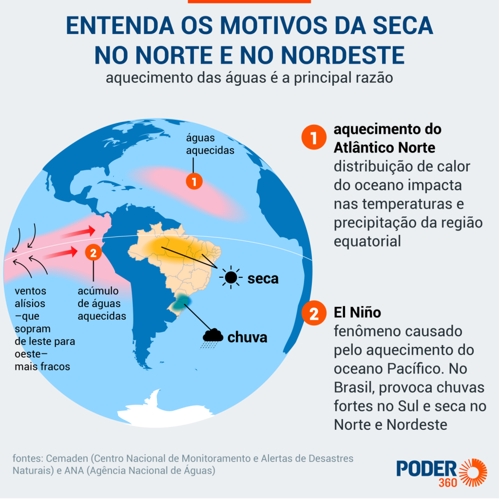 A seca intensa e prolongada também tem relação com o El Niño. Durante o fenômeno climático, chove com intensidade e frequência no meio do Oceano Pacífico. Nessas chuvas, o ar quente e seco continua circulando, porém, desce no norte da América do Sul e dificulta a formação de nuvens carregadas e de chuvas nas regiões Norte e Nordeste do Brasil.