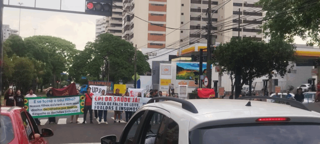 “Estamos ouvindo falar de Deus, de compaixão. A gente precisa de competência e compromisso com o povo”, gritou uma mãe no megafone. Ela contou que a Sesau exige documentos, mas as prateleiras do CEM (Centro de Especialidades Médicas) continuam vazias e as mães atípicas voltam para casa de mãos vazias.