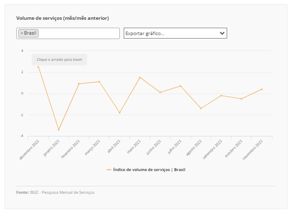 As outras três atividades registraram expansão na comparação contra novembro de 2022: serviços profissionais, administrativos e complementares (4,4%), prestados às famílias (5,4%) e outros serviços (3,3%).