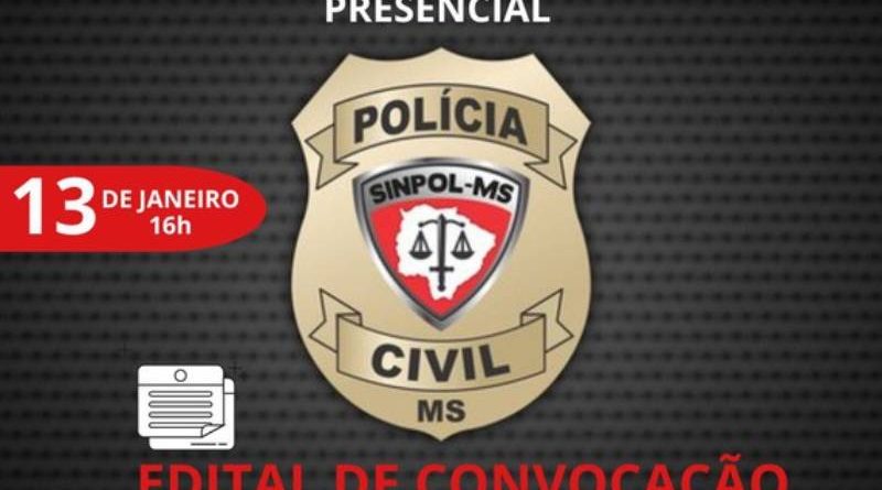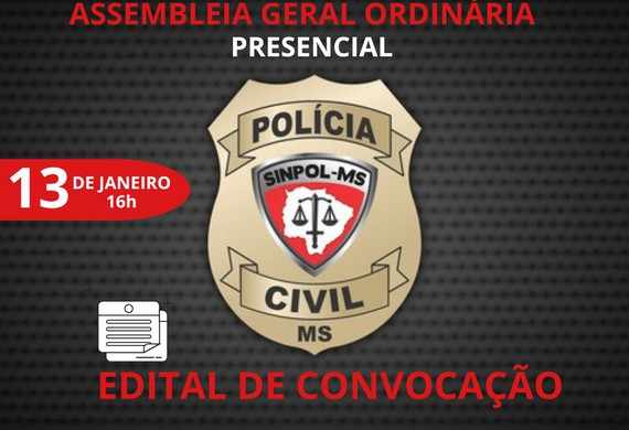 O SINDICATO DOS POLICIAIS CIVIS DO ESTADO DE MATO GROSSO DO SUL – SINPOL/MS, inscrito no CNPJ sob nº 01.105.436/0001-08, com registro sindical sob o número 24000.004233/91-13-MTE, CONVOCA seus os filiados para ASSEMBLEIA GERAL ORDINÁRIA a realizar-se no dia 13 de janeiro 2025 (segunda-feira), às 16:00 horas, em PRIMEIRA CONVOCAÇÃO, na sede do sindicato, na Rua Teodoro de Carvalho, 225, Bairro José Abrão – Campo Grande-MS, servindo esse instrumento para a convocação para nova assembleia, em SEGUNDA CONVOCAÇÃO, caso não atingido o quórum da maioria absoluta dos filiados em dia com as suas obrigações estatutárias, para o mesmo dia (13/01/2025) e local, às 16:30 horas, nos termos do artigo 15, alínea “a” c/c o § 1º do artigo 11, ambos do Estatuto Social, para deliberarem sobre a seguinte pauta: