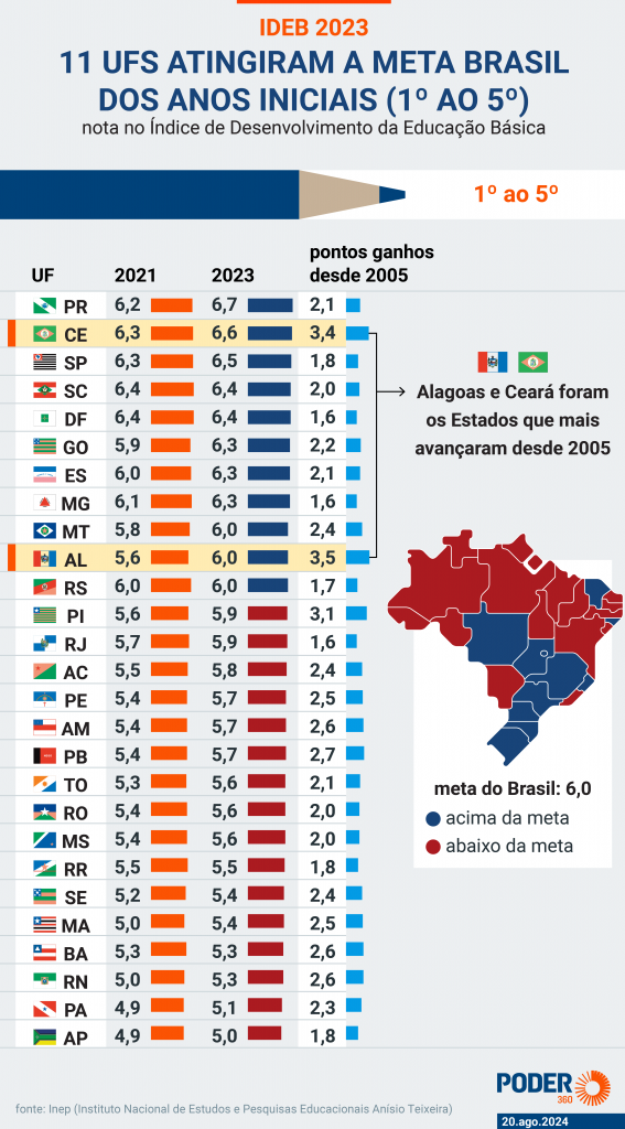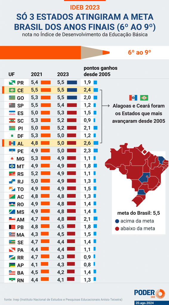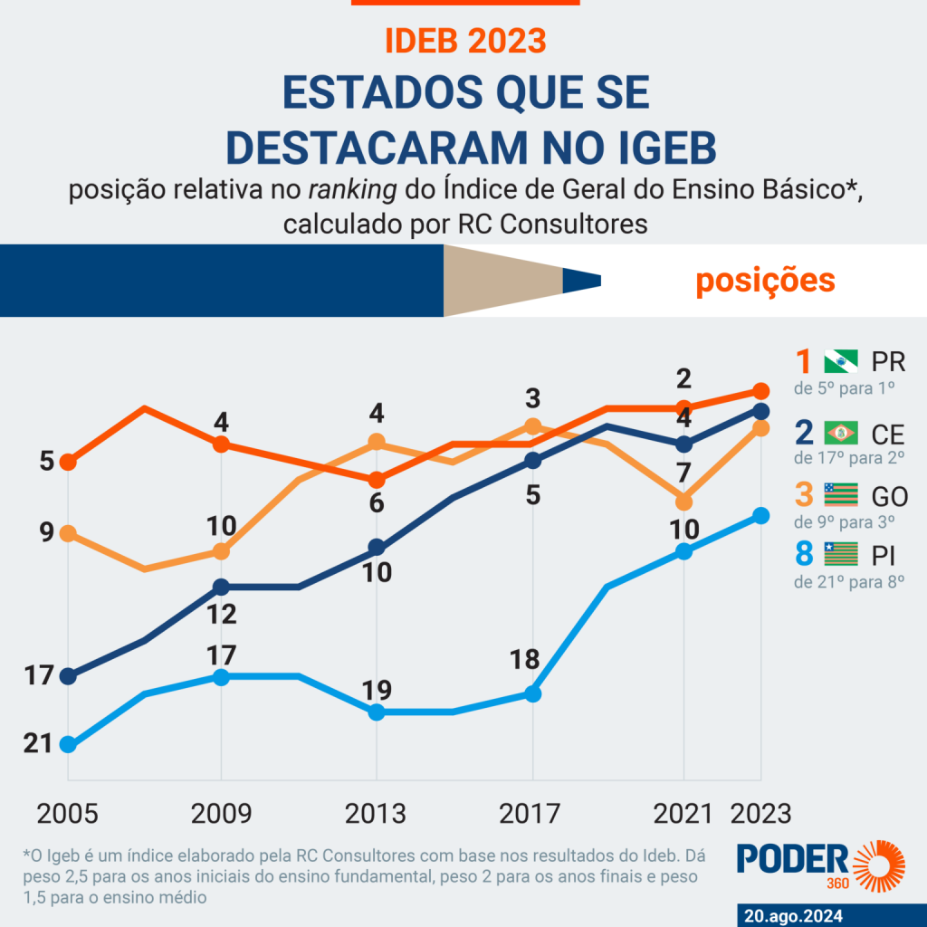 Há alguns Estados, Paraná e Ceará, em destaque, que não só revelam sua prioridade tradicional ao ensino básico, como mostram que as administrações recentes intensificaram tal interesse no aprendizado eficaz. O infográfico abaixo mostra as melhores evoluções estaduais ao longo do tempo.