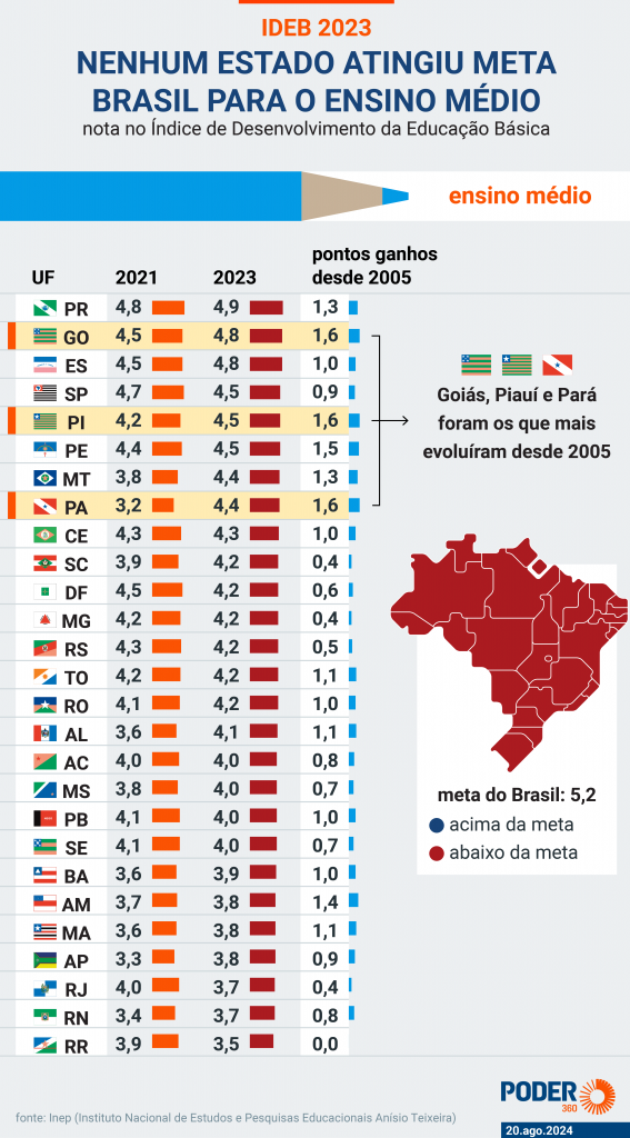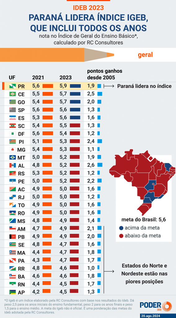 O Ideb (Índice de Desenvolvimento da Educação Básica) é uma medida estatística de desempenho da escolaridade, em esfera nacional, abrangendo escolas e alunos das redes pública e privada, aplicado pelo Inep (Instituto Nacional de Estudos e Pesquisas), do MEC (Ministério da Educação). O levantamento é bianual, realizado em anos ímpares desde 2007. A edição divulgada recentemente se refere a 2023, portanto capturando a situação do aprendizado nos níveis fundamental e médio (o chamado ensino básico) na fase pós-covid.