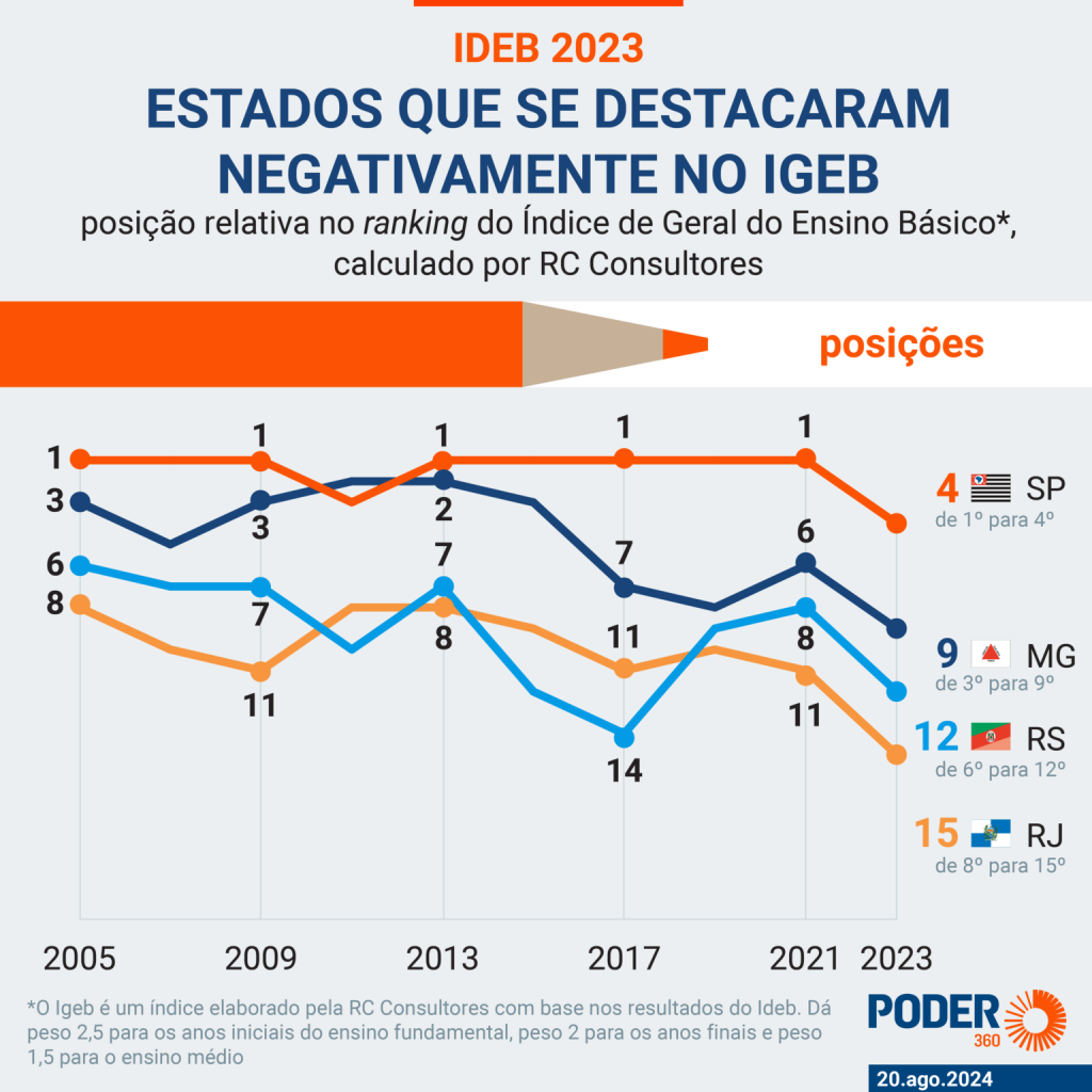 Na ponta oposta, há Estados de boa tradição no ensino básico que não têm conseguido manter suas posições de liderança relativa ou absoluta, casos de São Paulo, Minas Gerais, Rio de Janeiro e Rio Grande do Sul.