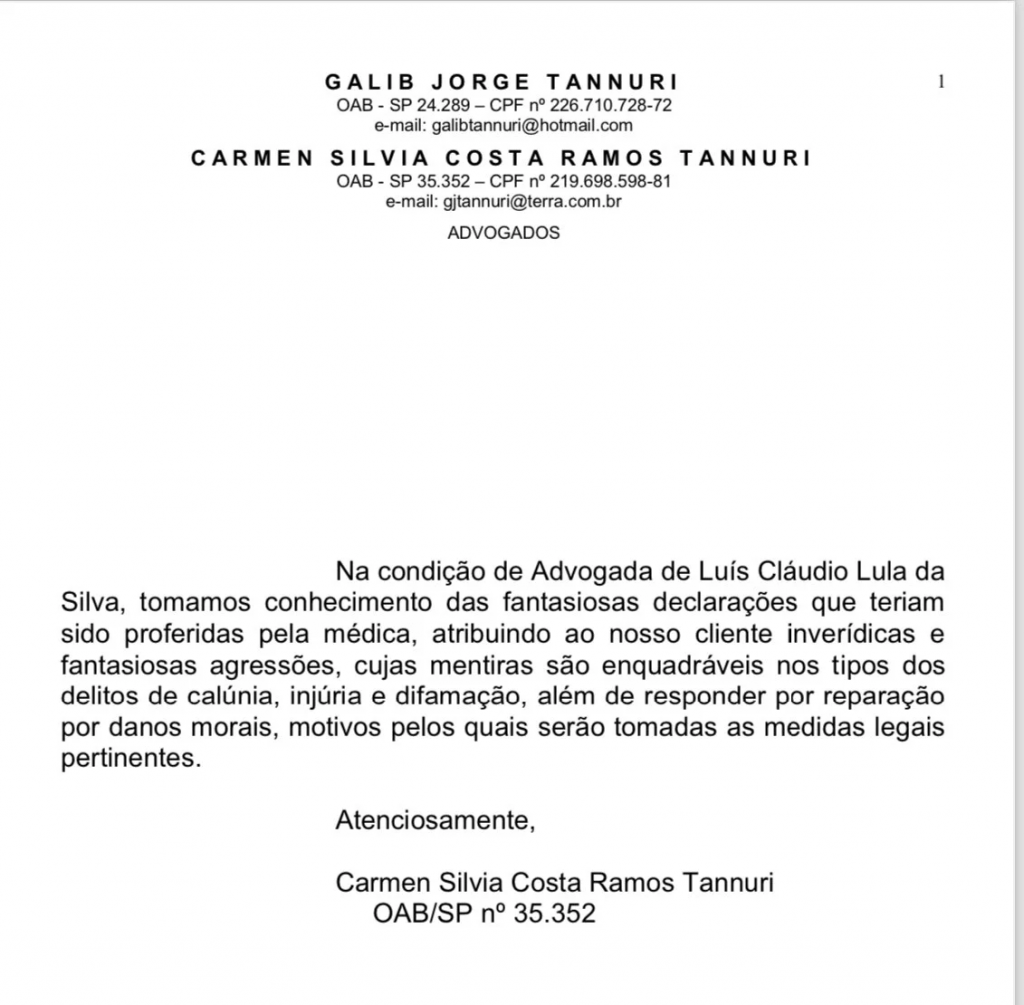 Em nota divulgada no X (ex-Twitter), a defesa do filho do presidente Lula afirma que tomou conhecimento das “fantasiosas declarações” que teriam atribuído a Luís Cláudio “inverídicas e fantasiosas agressões, cujas mentiras são enquadráveis nos tipos de delitos de calúnia, injúria e difamação”.