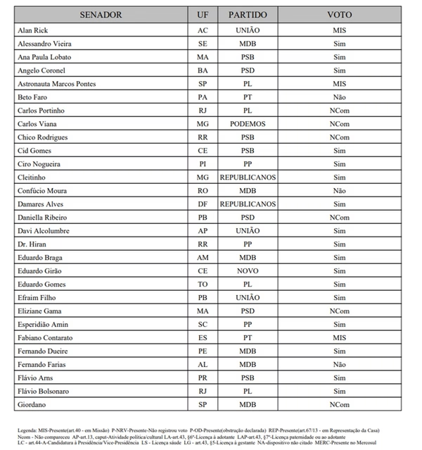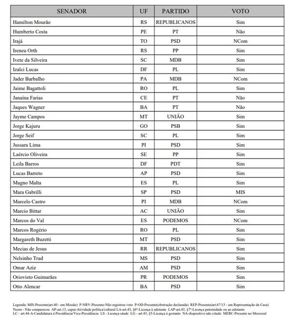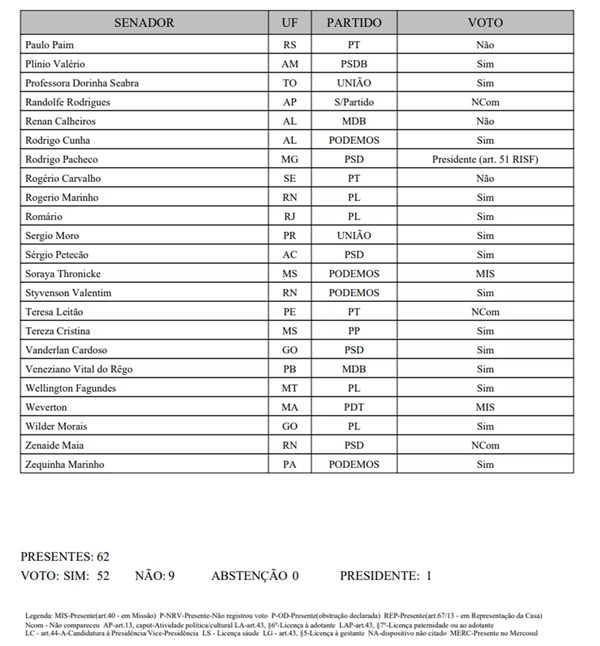 A matéria teve 53 votos favoráveis, 9 contrários e nenhuma abstenção em primeiro turno. Somente o PT orientou seus parlamentares a votarem contra a PEC.