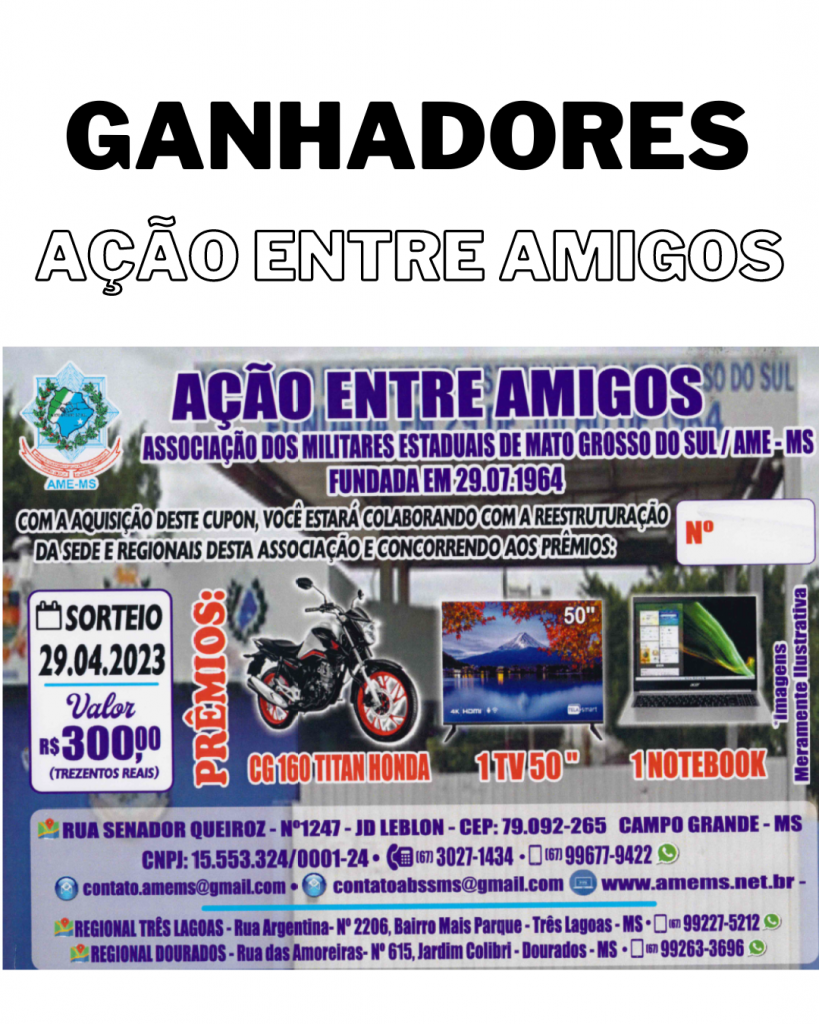 A Associação dos Militares Estaduais de Mato Grosso do Sul (AME-MS) realizou no último sábado (29) de setembro de 2023, o sorteio da Ação entre Amigos com o objetivo de angariar fundos para a reestruturação da sede e das regionais.
