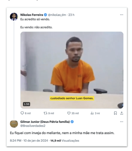 A gravação foi divulgada pelo deputado federal Nikolas Ferreira (PL-MG) em sua conta no X (ex-Twitter). Na publicação, o congressista descreve surpresa com o caso: “Eu acredito só vendo. Eu vendo: não acredito”.