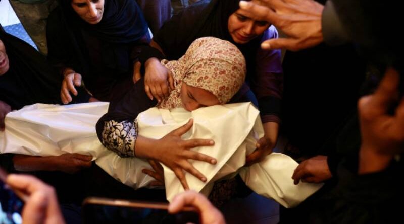 Uma mãe chora sobre o corpo de seu filho palestino de três anos, Iyad Ahmed Naeem Al-Rabai’a, morto por um ataque aéreo israelense em Khan Yunis, no sul da Faixa de Gaza. Foto por BASHAR TALEB/AFP