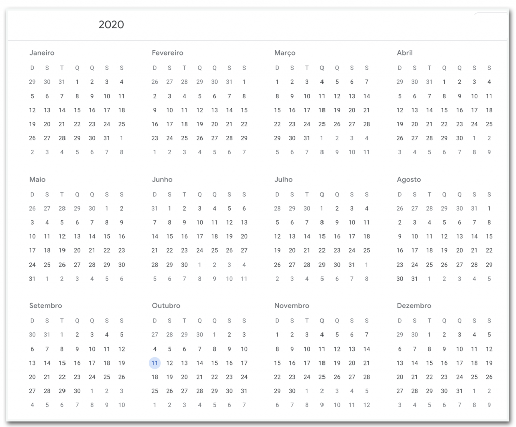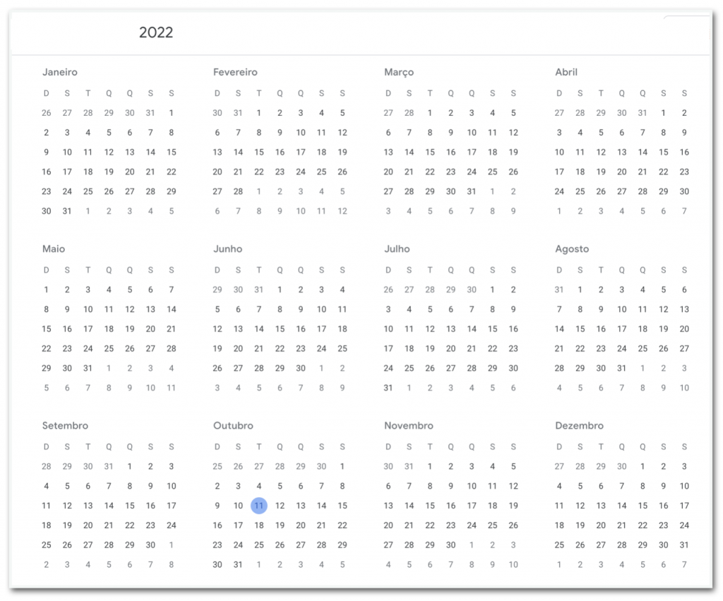 No calendário durante o mandato de Jair Bolsonaro (PL) só há um “11 de outubro” numa terça-feira em 2022 (e não em 2020).