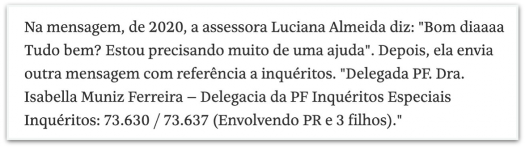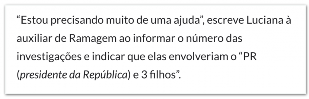 • A mensagem em si não é conclusiva. A assessora diz que precisa “muito de uma ajuda” e em seguida dá o número de um inquérito que, segundo ela, envolvia Jair Bolsonaro e 3 de seus filhos. Pela mensagem, não fica claro que tipo de “ajuda” seria.