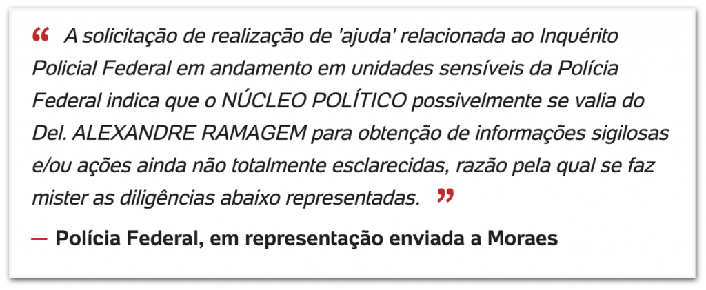 Fato é que a Polícia Federal investiga a atuação da Abin sob Ramagem de 2019 a 2021. A justificativa para a operação que mirou Carlos Bolsonaro na 2ª feira, segundo Moraes, foi o apontamento de um “fato novo” pela PF: a existência de um “Núcleo Político”.