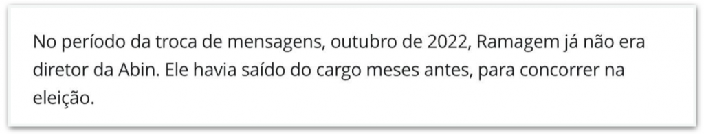 G1 – o site de notícias do Grupo Globo notou que se tratava de 2022 e que Ramagem já estava fora da Abin, mas não explicou o que isso significava para o leitor: “No período da troca de mensagens, em outubro de 2022, Ramagem já não era diretor da Abin”, disse o portal.