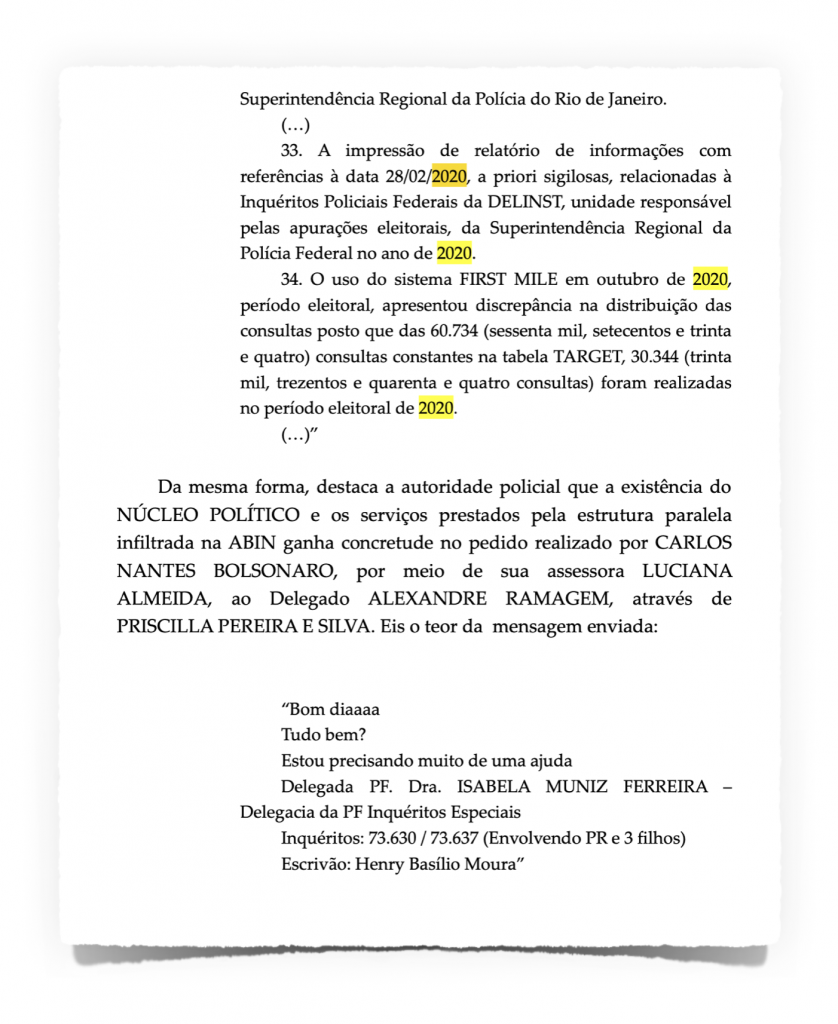 Na decisão de Moraes, a mensagem é reproduzida logo depois de o ministro citar várias supostas irregularidades em outubro de 2020. A data da conversa entre Ramagem e Luciana é “ter., 11 de out”.
