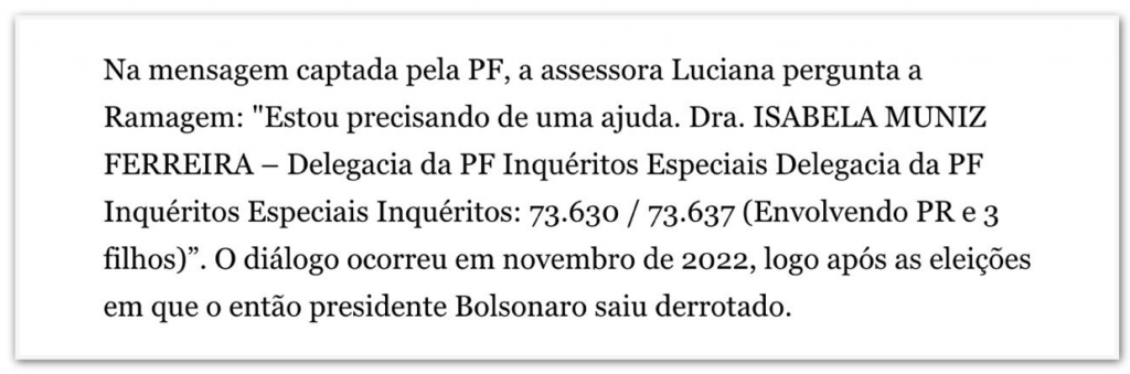 Estadão – o jornal não informou de quando eram as mensagens: “escreve Luciana à auxiliar de Ramagem ao informar o número das investigações”.