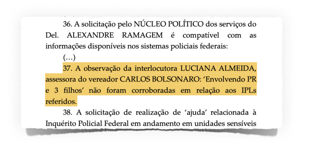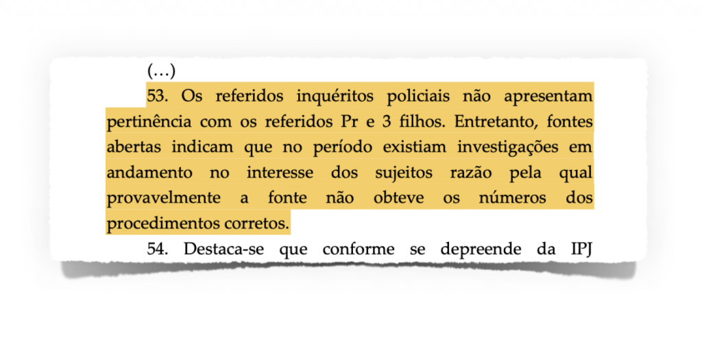 No próprio relatório da PF, a corporação diz que a “observação” de Luciana Almeida sobre os inquéritos envolverem Bolsonaro e seus 3 filhos “não foram corroboradas em relação aos IPLs referidos”. Em outras palavras, os números de inquéritos fornecidos, segundo a PF, não dizem respeito a Bolsonaro e seus filhos.