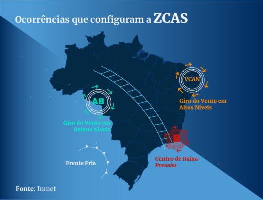A ZCAS influencia nas chuvas principalmente em partes das regiões Norte, Centro-Oeste, Sudeste e até em uma porção do Nordeste. Quanto à Região Sul, não é comum que a ZCAS cause impacto, mas isto pode acontecer.