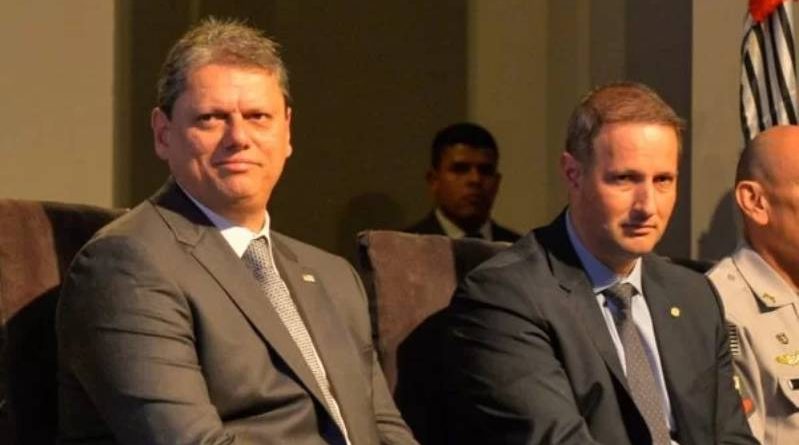 Tarcísio e Derrite Imagem colorida mostra Guilherme Derrite, homem branco, vestido de terno escuro e camisa branca