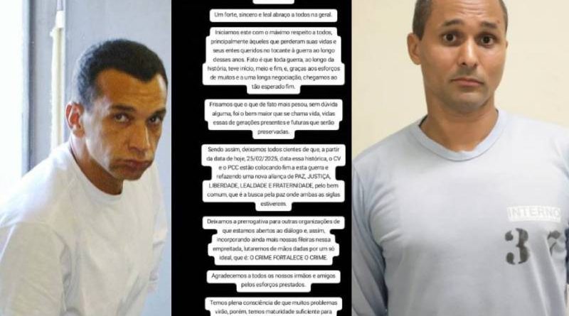 Com data marcada, de terça-feira 25 de fevereiro, texto que circula por aplicativos de mensagem sugere que as duas maiores organizações criminosas do Brasil, o Comando Vermelho (CV) e o Primeiro Comando da Capital (PCC), selaram a paz.