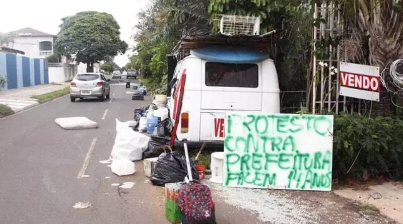 Em protesto na Rua Planalto, que liga a Avenida Eduardo Elias Zahran com a Fábio Zahran, na região dos bairros TV Morena e Jardim Paulista, o vendedor José Fernandes da Silva, 52 anos, cobra pagamento da Prefeitura de Campo Grande pela desapropriação de terrenos dele na época da execução do projeto Cabaça/Areias, de 2009, que abriu vias e realizou obras de drenagem na área citada.