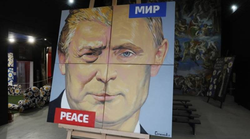 A obra de arte intitulada “A Paz” (2017), do artista russo Alexey Sergienko, que retrata o presidente russo Vladimir Putin e o presidente dos EUA Donald Trump, está novamente em exibição na galeria do artista em São Petersburgo, na Rússia/Foto: ANATOLY MALTSEV/EFE/EPA
